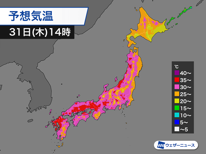 7月最終日も危険な暑さ 広い範囲で体温超えの気温