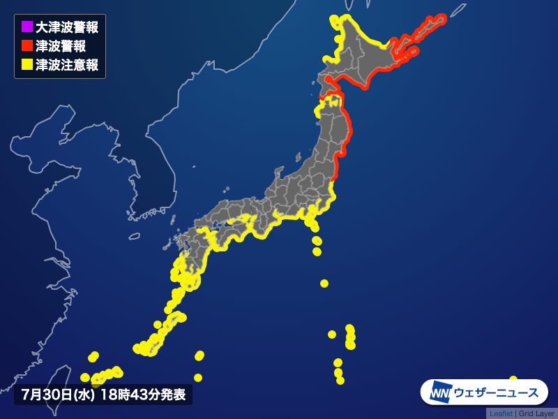 各地の津波の高さはピークを過ぎていて、最大波の更新がなくなってきたことから、気象庁は18時30分に一部の津波警報を注意報に切り替えました。19時30分の時点では北海道と東北の太平洋側に津波警報が発表中です。