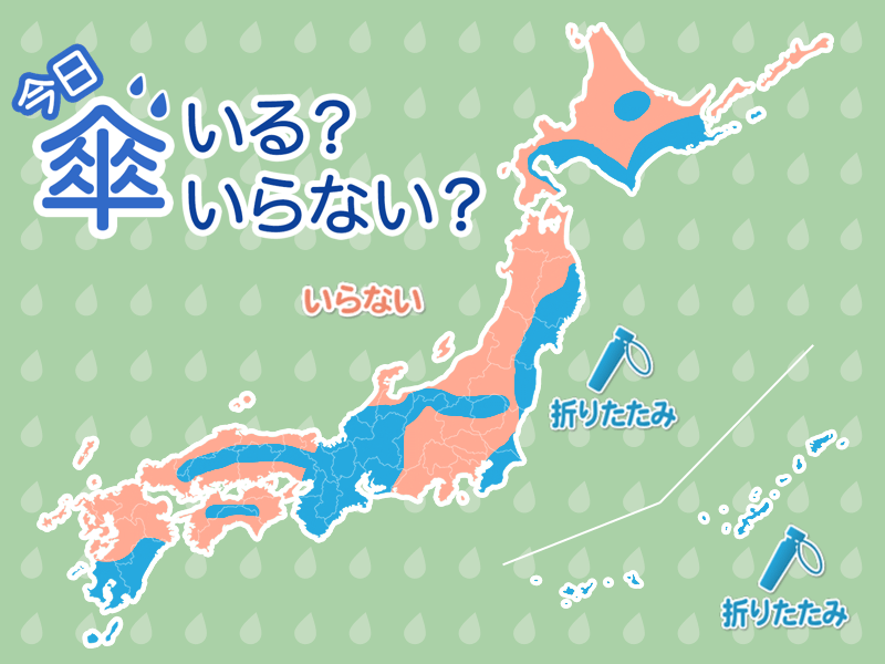 東海や近畿、東北太平洋側~関東、沖縄ではにわか雨の可能性があります。折りたたみ傘や晴雨兼用の傘があると安心です。