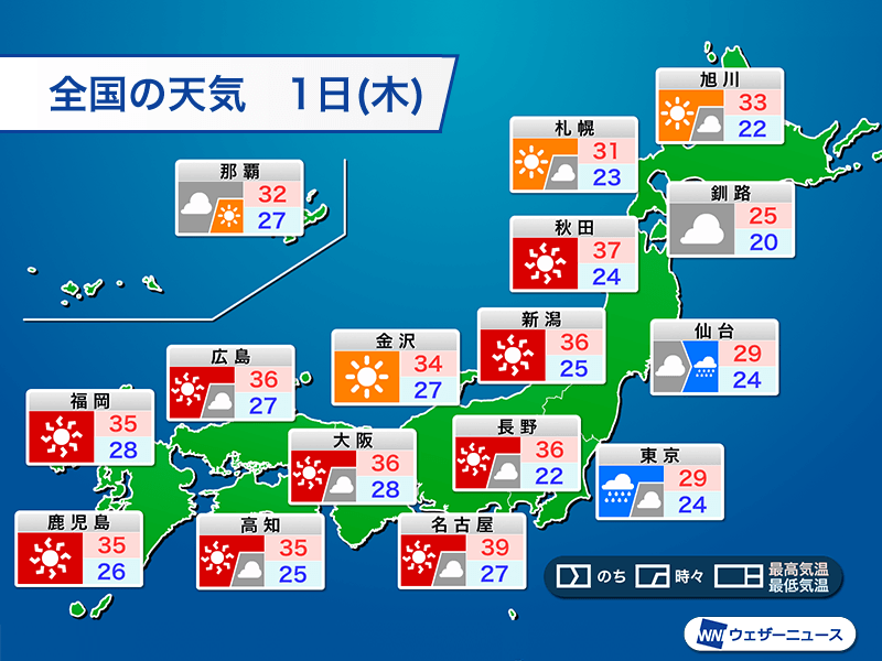 8月に月が変わっても暑さには大きな変化がありません。明日1日(金)も西日本や東海、東北日本海側の広い範囲で35℃以上の猛暑日が予想され、名古屋市は39℃の危険な暑さになる見込みです。