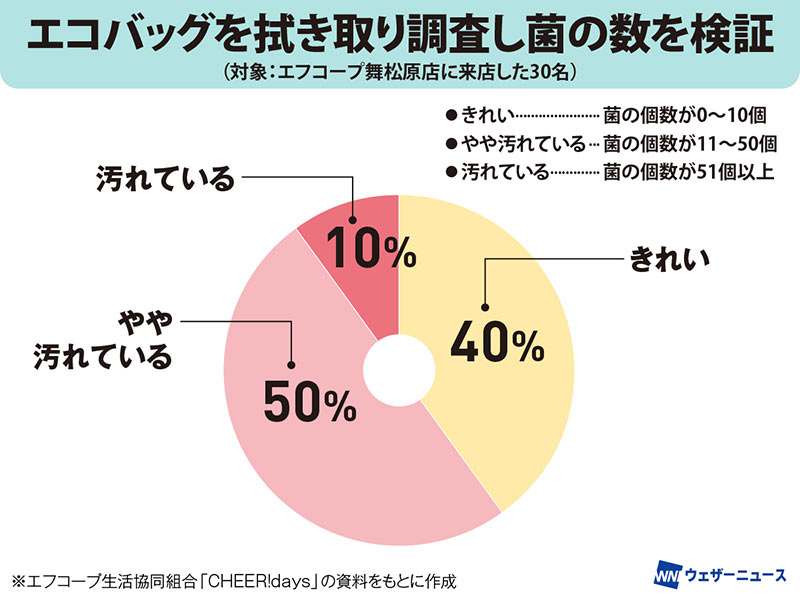 また、聞き取りした方の中から30枚のエコバッグを拭き取り、拭き取った箇所から菌の個数を調べてみました。この調査では、店舗作業場の点検で行う拭き取り検査の衛生基準を参考に、付いた菌数が0~10個を【きれい】、11~50個を【やや汚れている】、51個以上を【汚れている】として分類しました」(光安さん)
