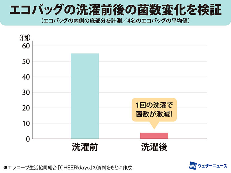 「除菌効果がある一番簡単な方法は洗濯です。エフコープ生活協同組合のスタッフが普段使っているエコバッグの内側底部分の菌数を計測し、洗濯前後でどこまで除菌ができるか検証してみました」(光安さん)