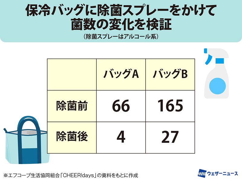 保冷バッグを2種類用意し、アルコール系の除菌スプレーをかけて菌数の変化を調べたところ、いずれも菌数の減少が見られました。洗濯できないエコバッグは除菌スプレーなどを使用して衛生状態を保つのがポイントです」(光安さん)