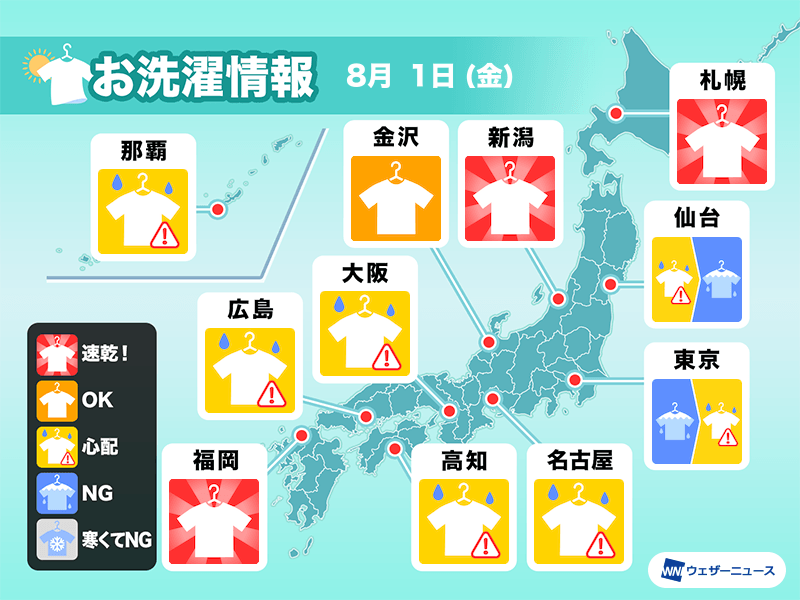 東海や西日本、沖縄は変わりやすい天気のため、すぐに取り込めない場合は室内干しが安心です。
