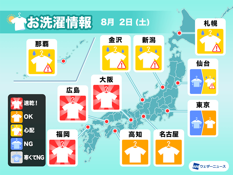 東海や西日本では晴れて強い真夏の日差しが照りつけるため、洗濯物が早く乾きそうです。