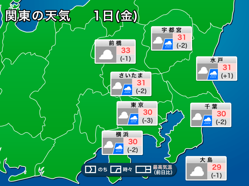 関東ではこの後も曇りや雨の天気が続き、それほど暑くはならない見込みです。予想最高気温は30℃前後で厳しい暑さではないものの、湿気が多くムシムシと感じられそうです。