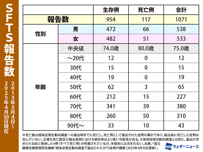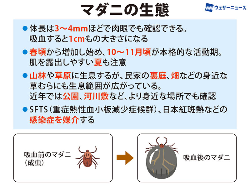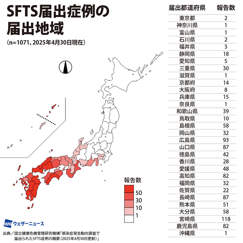 特に SFTS(重症熱性血小板減少症候群)は、これまで感染報告のなかった地域でも確認されるなど、感染地域は徐々に拡大しています。