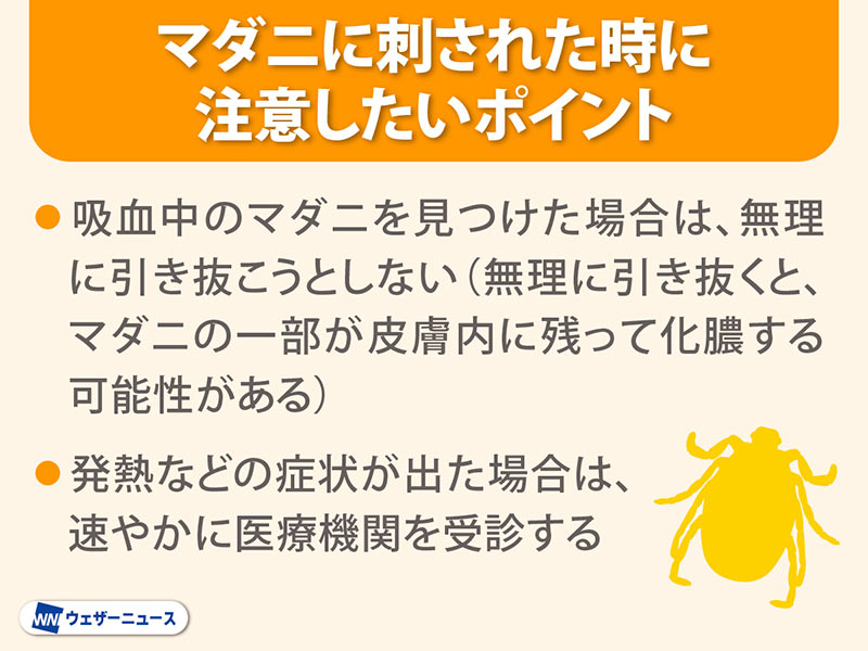 無理に引き抜くと、マダニの一部が皮膚内に残って化膿する可能性があります。マダニに刺された後に発熱などの症状が出た場合は、速やかに医療機関を受診してください」