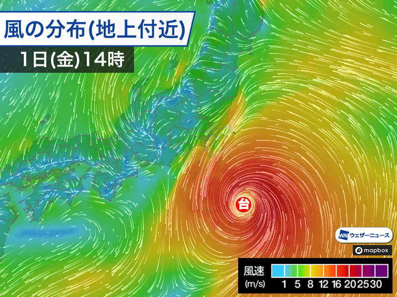 台風の北上に伴い、伊豆諸島や関東、東海では風も強くなってきました。今日は伊豆諸島や伊豆半島の所々で最大瞬間風速20m/s以上を観測しました。関東地方の平野部でも北風がやや強く吹いています。