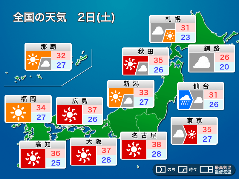 新潟33℃、秋田35℃、札幌31℃と、北日本も暑さが続きます。