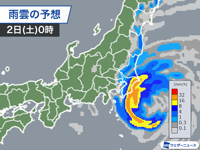 台風は明日2日(土)の朝に関東の東海上に達し、北東に進路を変える見通しです。関東に最も接近するのは、今夜から明朝となりそうです。上陸の可能性は低く、海上を進むとみられます。