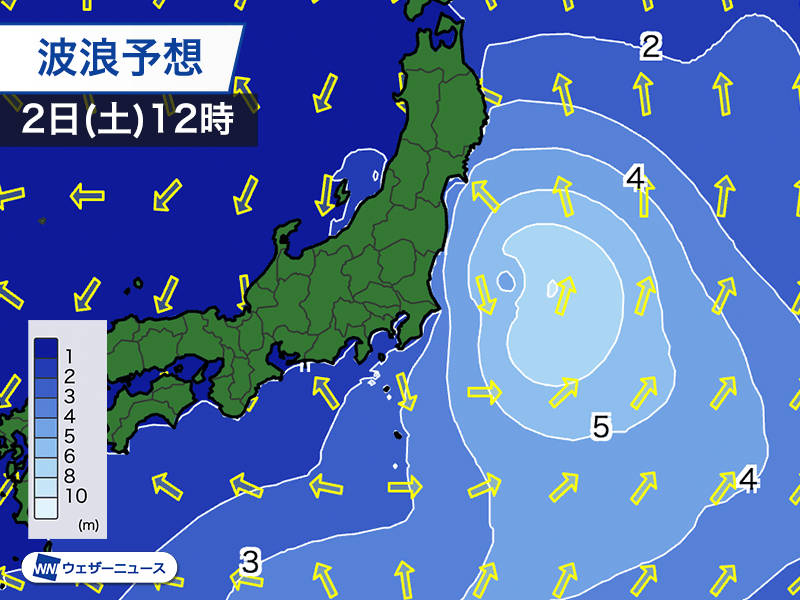 しかし、天気が回復した後も海上は波の高い状態が続く見込みです。特に千葉県や茨城県の太平洋沿岸では3m以上の高波やうねりとなりますので、海のレジャーは要注意です。東北の太平洋側でもうねりを伴った高波にお気をつけください。