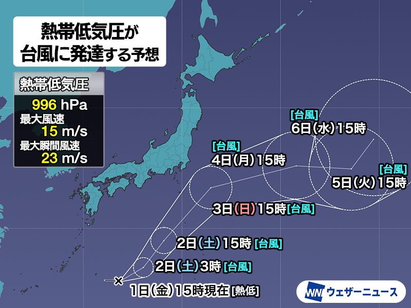 一方、南大東島の東で発達中の熱帯低気圧は台風へと変わった後、日本の南の海上を足早に北東へ進む見込みです。台風9号の後を追うように進む見通しで、明後日8月3日(日)頃に伊豆諸島に近づく予想となっています。