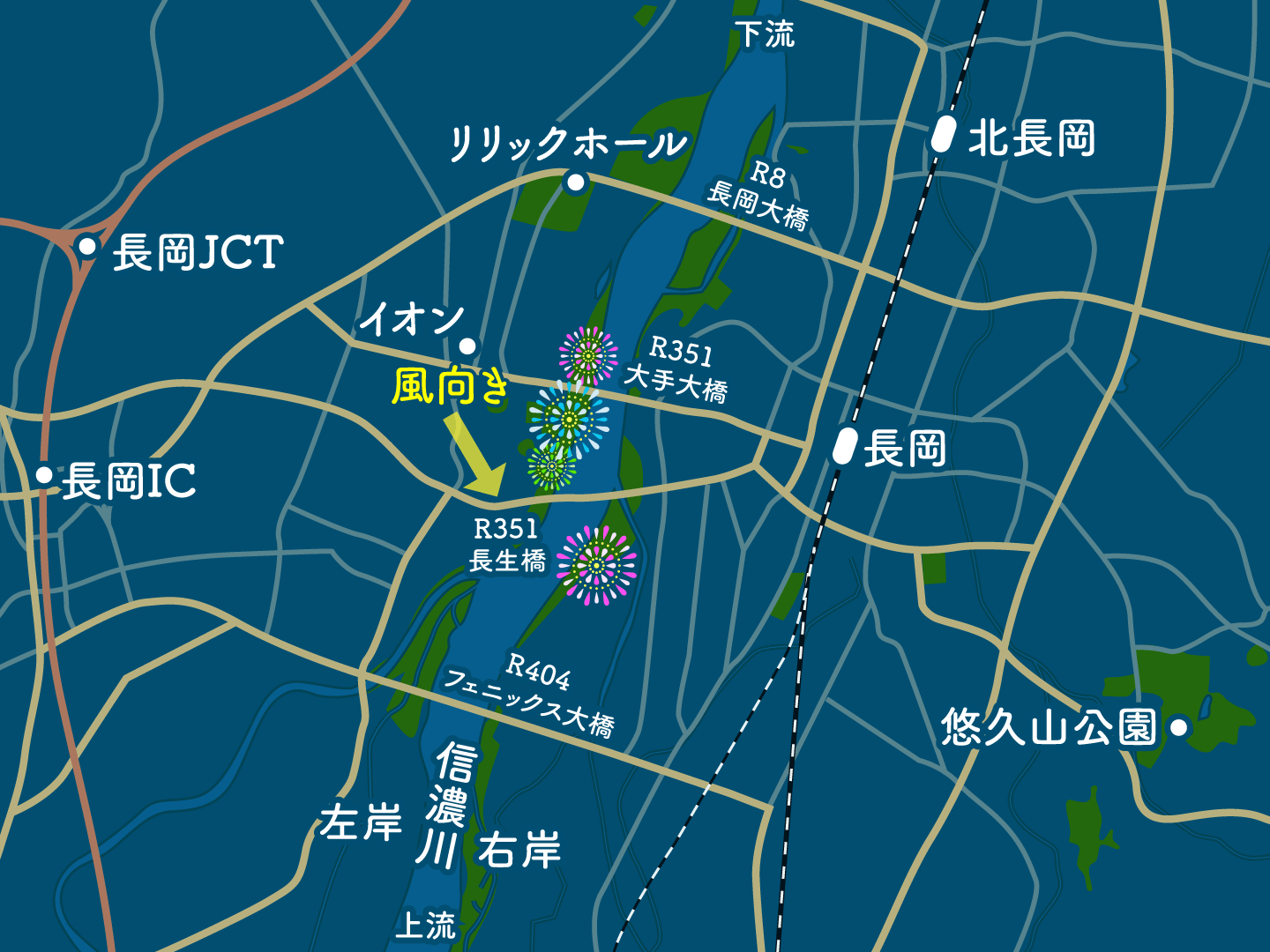 昼間は海側(柏崎方面・左岸側)からの風が吹きますが、開催時間帯に近づくにつれて風が弱まる見通しです。強風で花火の打ち上げに支障が出るような心配はありませんが、花火大会開催中は北寄りの風となります。