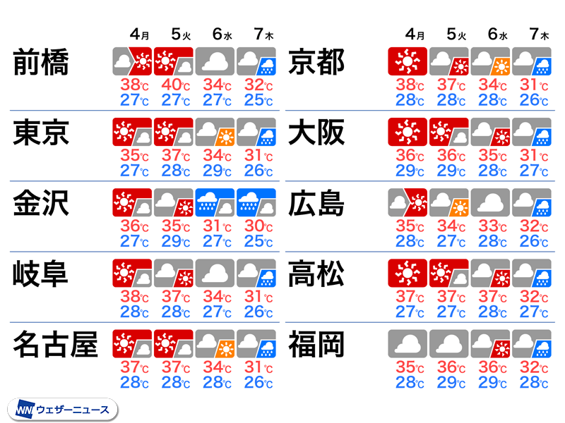 特に5日(火)は日本海を前線が南下することで、高気圧の縁を吹く西寄りの風が強まり、フェーン現象の影響を受ける関東で気温が上がりやすくなります。群馬県前橋市や伊勢崎市、埼玉県熊谷市などで40℃以上の予想です。今日と似たようなパターンの暑さになるとみられます。