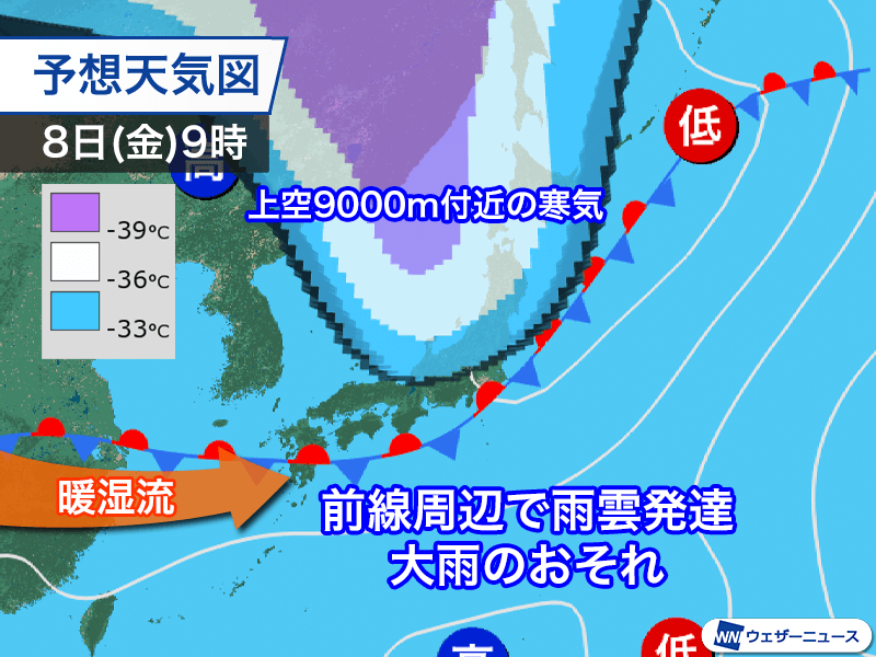 前線に向かっては暖かく湿った空気が継続的に流れ込む上、上空に寒気を伴った気圧の谷が進んでくることで、雨雲が発達しやすくなります。前線の動きによっては雨量が多くなり、大雨となる可能性がありますので、注意が必要です。