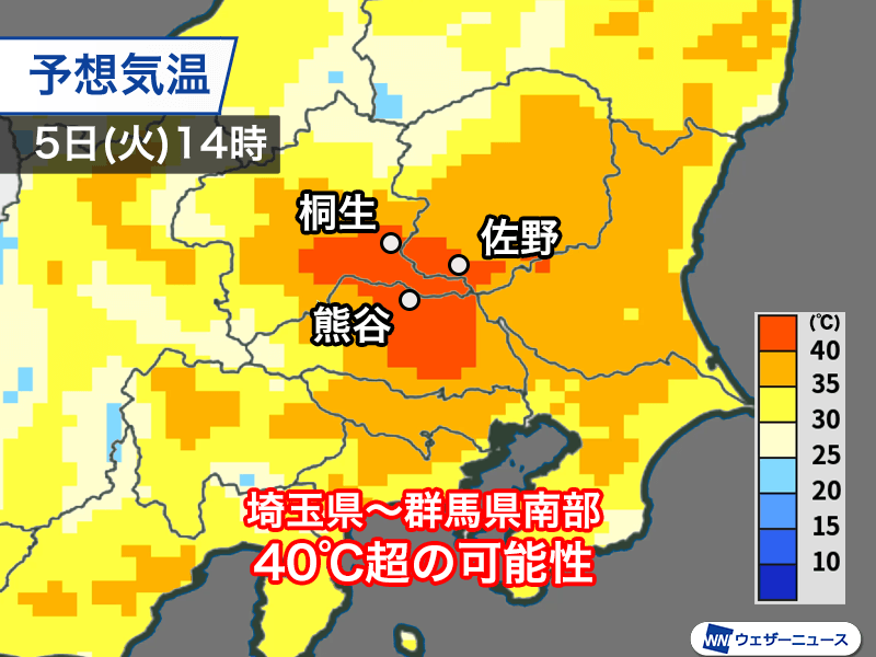 現時点では群馬県伊勢崎市や桐生市、埼玉県熊谷市、栃木県佐野市で40℃を予想。東京都内でも八王子市と青梅市で39℃まで上がるとみられます。