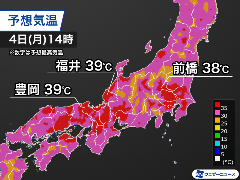 明後日はさらに前線が南下するため、日本海側は雲が広がって暑さが少し落ち着きます。関東では晴天が続く上、西寄りの風が強まることで、気温が上がりやすく、内陸部の広い範囲で38〜39℃まで上昇する見込みです。