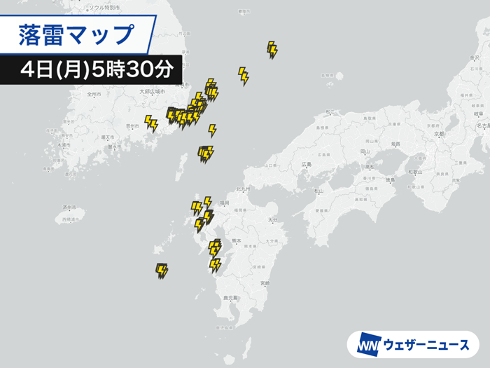 前線の接近に伴い大気の状態が不安定になります。東シナ海側を中心に雨雲が発生・発達しやすく、局地的に雷を伴って雨が強まる見込みです。長い時間降り続く雨ではないものの、次々に雨雲が通過するため、雨具は欠かせません。突風などにも注意してください。