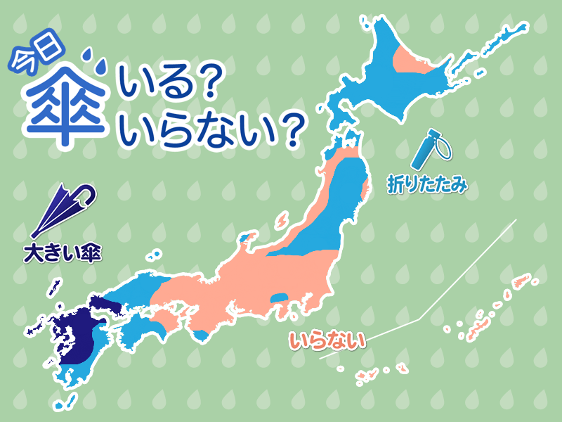 西日本は湿った空気や接近する前線の影響を受け、太平洋側や中国地方の西側で雨の降る可能性があります。外出は折りたたみ傘をお持ちください。