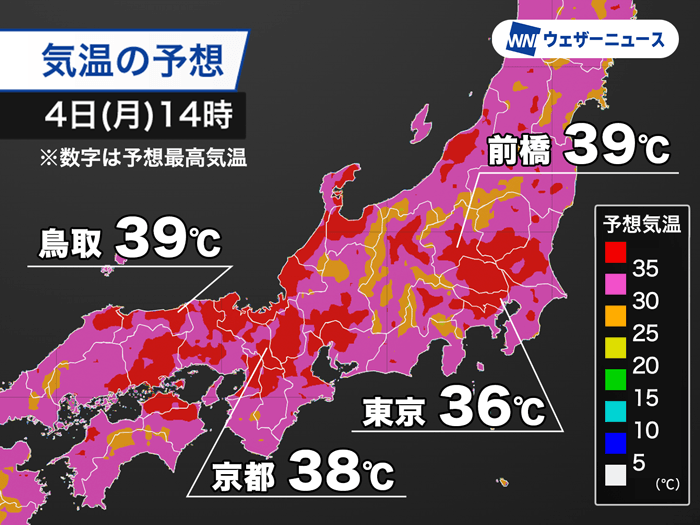 予想最高気温は前橋市では39℃と体温を大幅に超える気温が予想されていて、さいたま市や甲府市、長野市でも38℃まで上がる予想です。近畿でも京都市や奈良市、大津市などで38℃予想となっています。