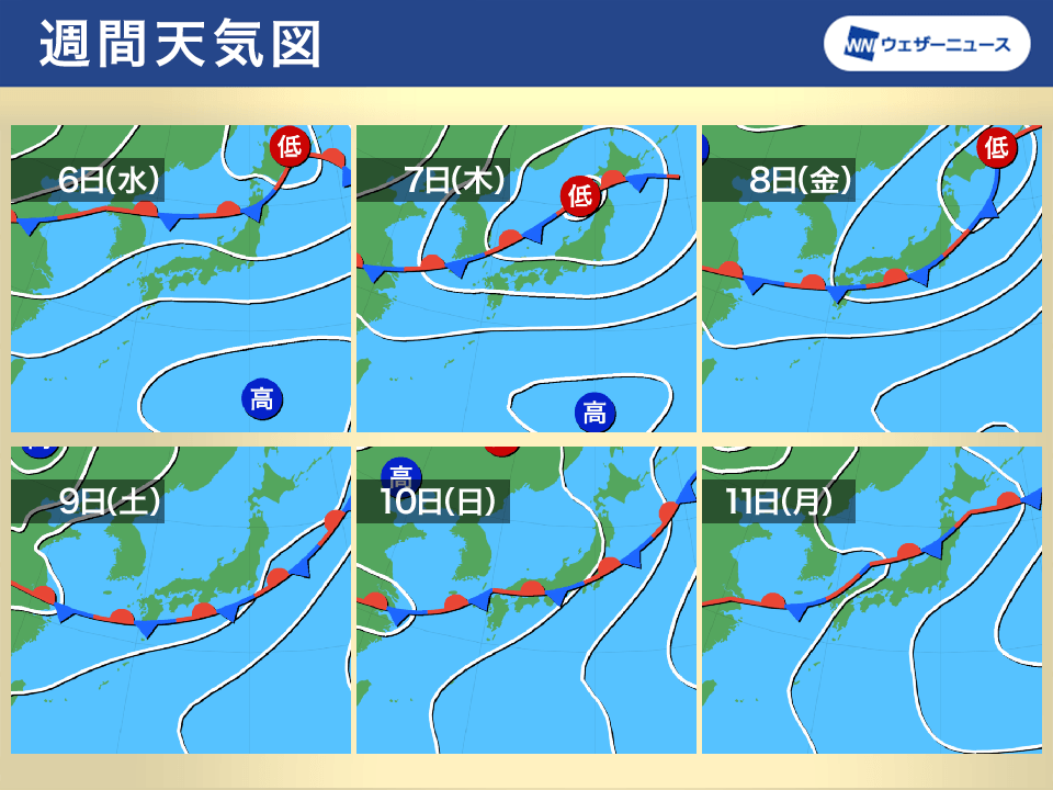 今週中頃以降は前線が本州をゆっくり南下するため、全国的に雨の降る所が多くなる見通しです。特に7日(木)は東北の日本海側や北陸を中心に強雨や大雨に警戒が必要です。
