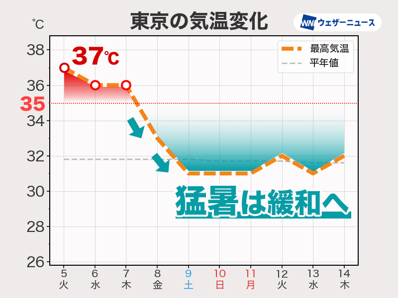前線の南下に伴い、これまで続いていた40℃に迫る危険な暑さは緩和される見込みです。関東では7日(木)までは猛暑が残るところもある予想ですが、今週後半は東日本や西日本での危険な暑さは落ち着く見込みです。