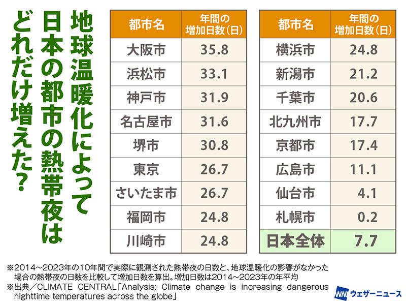 CLIMATE CENTRAL「Analysis: Climate change is increasing dangerous nighttime temperatures across the globe」、気象庁「大都市における熱帯夜日数の長期変化傾向」