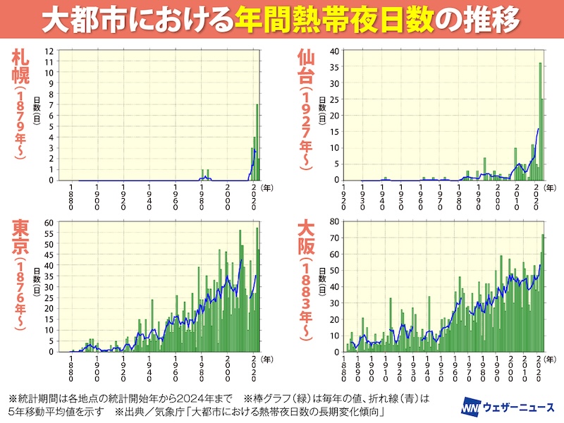 仙台でも熱帯夜の観測は1940年代に1日、60年代に計2日、70年代に1日などと極めて少なかったのですが、2010年に初めて2ケタの10日を観測。以降16年を除いて毎年熱帯夜が観測されるようになり、23年にはついに36日を観測。24年も25日を数えています。