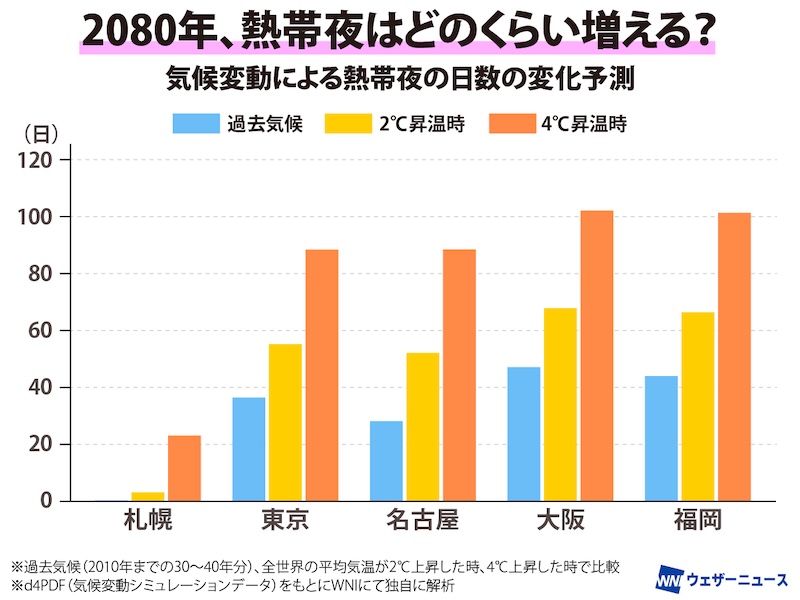 このまま温暖化が進行していくと、日本の熱帯夜は将来どのような状態になっていくのでしょうか。d4PDF(気候変動シミュレーションデータ)をもとに、ウェザーニュースが独自に分析しました。