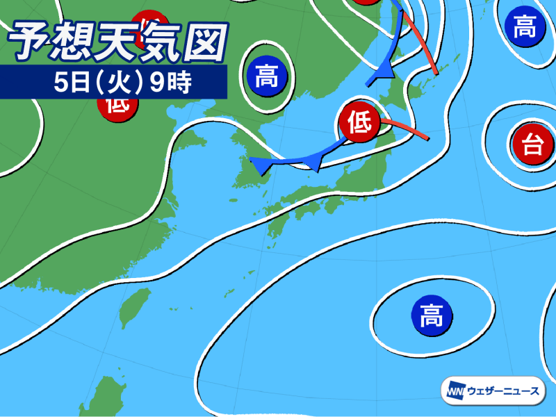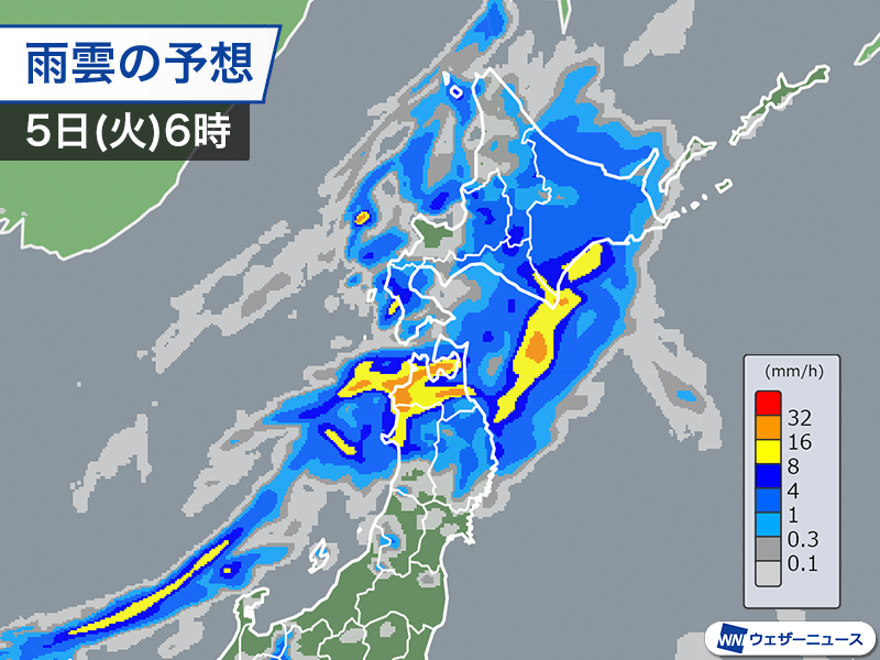 夜には日本海側から雨が降り出し、明日5日(火)の朝には北海道や東北北部の広い範囲で天気が崩れます。