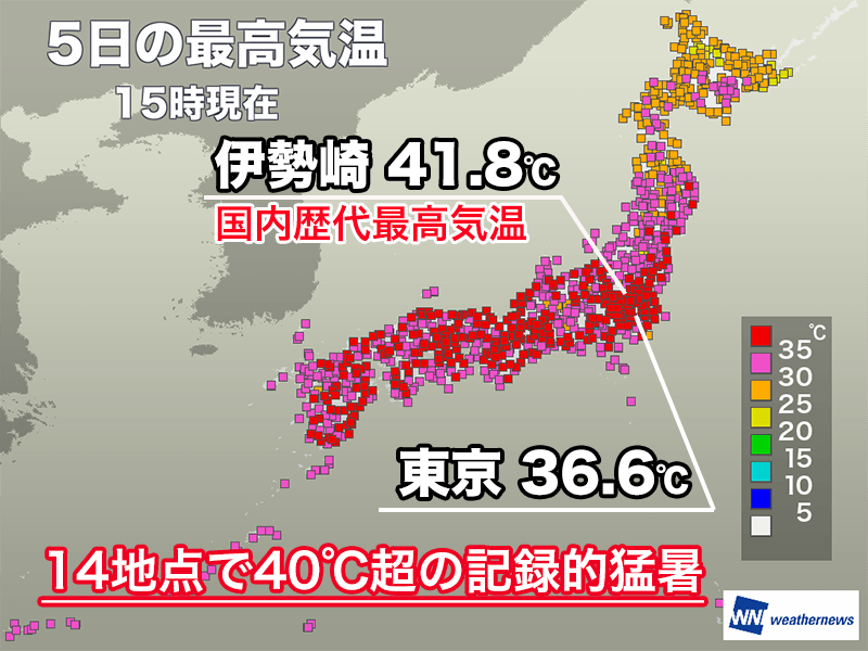 この日は埼玉県鳩山町や群馬県桐生市でも40℃超を観測し、午後3時半までに全国14地点が40℃以上を記録。これは観測史上最多の数字となりました。