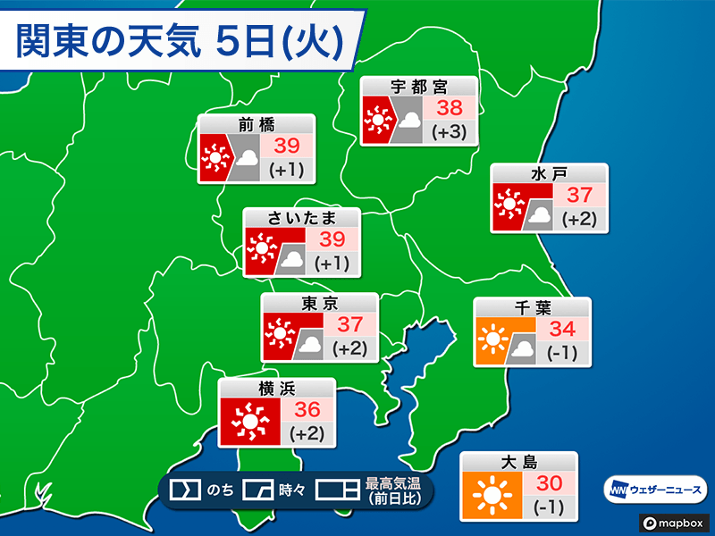 今日の関東は強い日差しで内陸部中心に危険な暑さ 熊谷など40℃予想