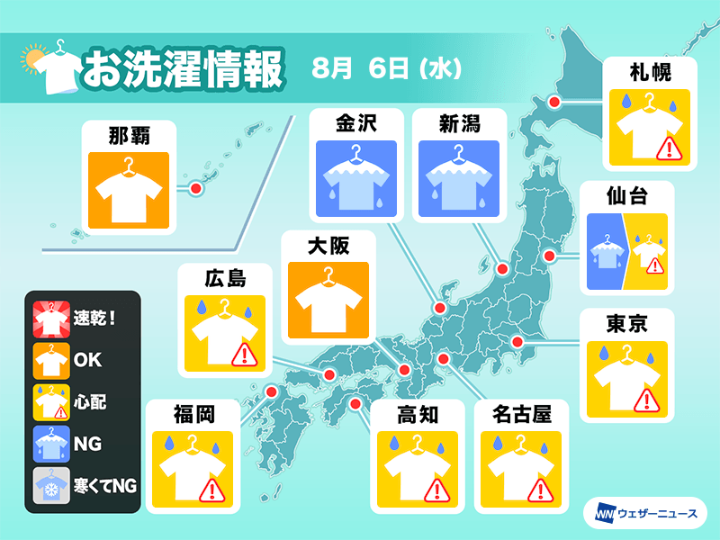 北海道や東北の太平洋側、関東、西日本では、朝は晴れていても午後は天気急変の可能性があります。長時間外出される方は部屋干しが安心です。