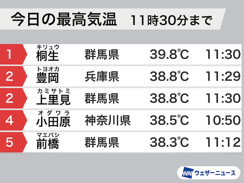 11時30分までに神奈川県小田原市や埼玉県熊谷市、群馬県前橋市で38℃以上を観測しています。群馬県桐生市では39.8℃を観測するなど、関東各地で午前中から体温超えの猛暑となっています。