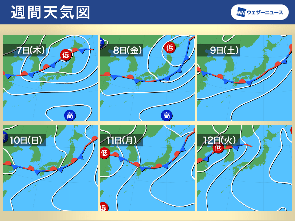 本州の南岸まで南下した前線は週末以降は再び北上傾向となり、本州付近に停滞します。そのため、東北から九州の広範囲で曇りや雨となり、梅雨が戻ったような天気が続きます。特に8日(金)から11日(月・山の日)を含む三連休にかけては、湿った空気の影響を受けやすい九州の東シナ海側を中心に大雨となる可能性があり警戒が必要です。前線の動向には不確実性があるため、最新の気象情報を随時ご確認ください。