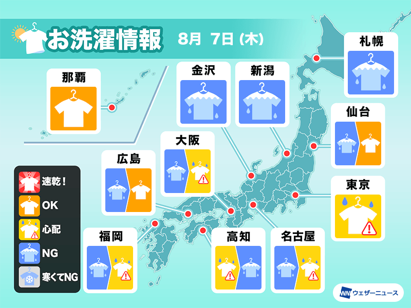 関東は日差しが届くものの、にわか雨の可能性があるため、長時間外出する場合は部屋干しの方が安心です。