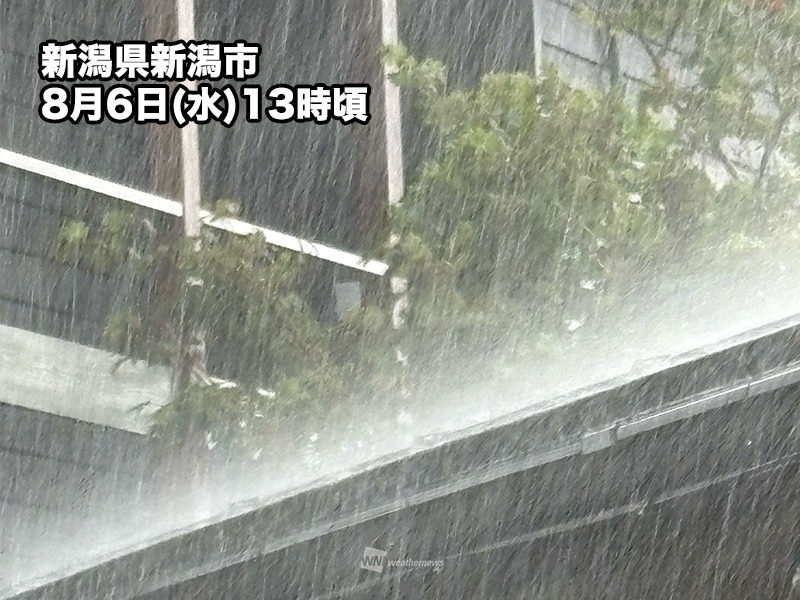 能登半島から新潟県下越には活発な雨雲の流れ込みが続いていて、今朝は石川県の輪島で1時間に47mmの激しい雨を観測しました。新潟県佐渡島の羽茂では13時30分までの24時間に8月としては観測史上最大となる180.5mmの降水を観測しました。
