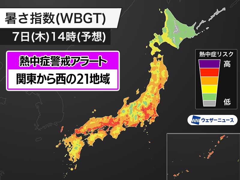 明日8月7日(木)の熱中症警戒アラート 関東から西の21地域に発表