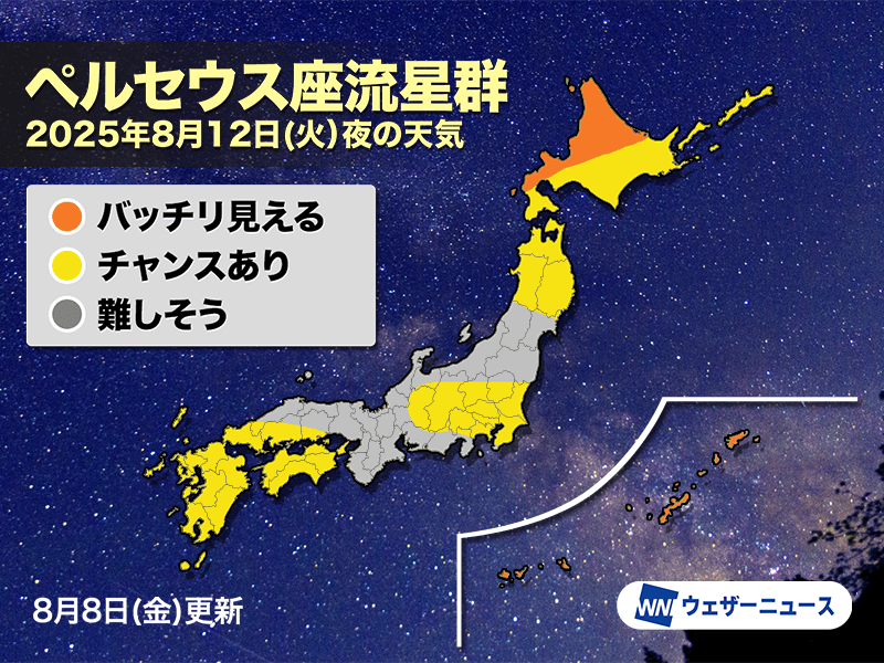 前線から遠く離れた沖縄や奄美、小笠原諸島、北海道は星空を見られる可能性が比較的高く、ペルセウス座流星群の観測には好条件となりそうです。