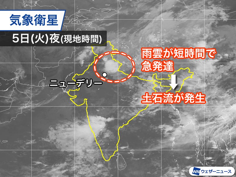 ヒマラヤ山脈に近いウッタラカンド州の山あいでは5日(火)に雨が激しく降り、大規模な土石流災害が発生しました。多くの家屋が流され、多数の行方不明者がいると報じられています。衛星画像では雨雲が急発達している様子が捉えられました。