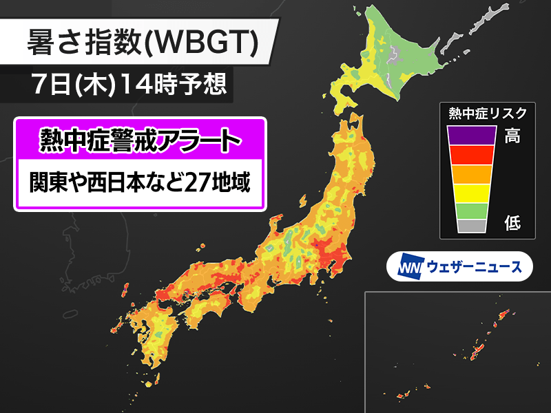 今日8月7日(木)の熱中症警戒アラート 関東から西日本中心に27地域に発表