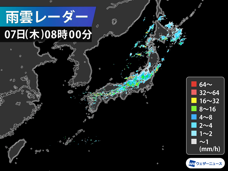 広島県・八幡では6時までの1時間に47.0mm、長野県・木曽薮原では7時40分までの1時間に49.0mmの激しい雨を観測しました。