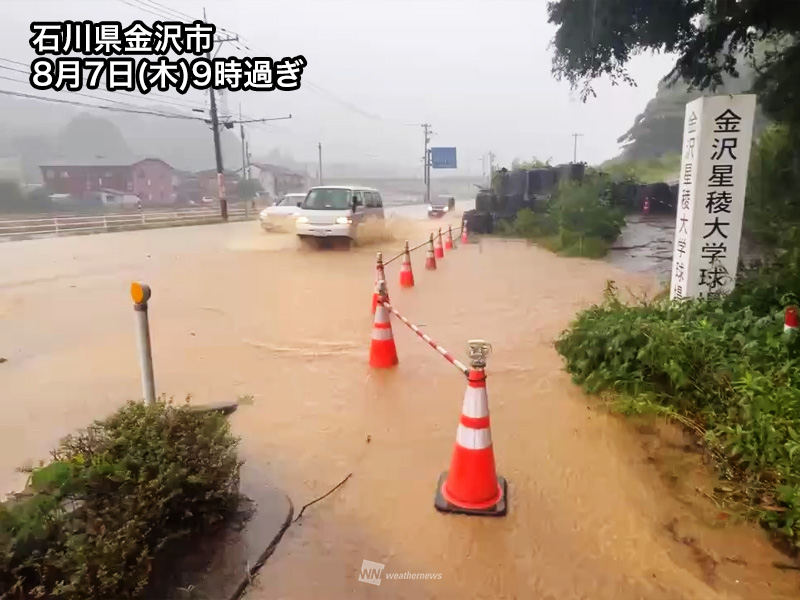 金沢市では9時10分までの1時間に62.0mmの非常に激しい雨を観測しました。未明にも1時間に60mm以上の雨量を観測するなど、断続的に非常に活発な雨雲が通過しています。