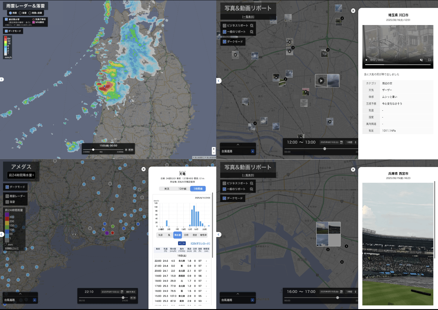 16日(土)は埼玉県川口市付近では14時10分までの1時間に約110mm、静岡県浜松市北部平野部付近では14時20分までの1時間に約120mmの猛烈な雨が降ったとみられ、気象庁は記録的短時間大雨情報を発表しました。