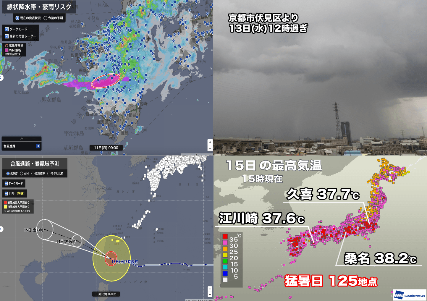 13日(水)は北日本や西日本を中心に大気の状態が不安定になり、局地的に雨雲が発達して激しい雨が降った地点がありました。京都市周辺で局地的に雨雲が発達して激しい雨が降り、宇治市には大雨警報が発表されました。