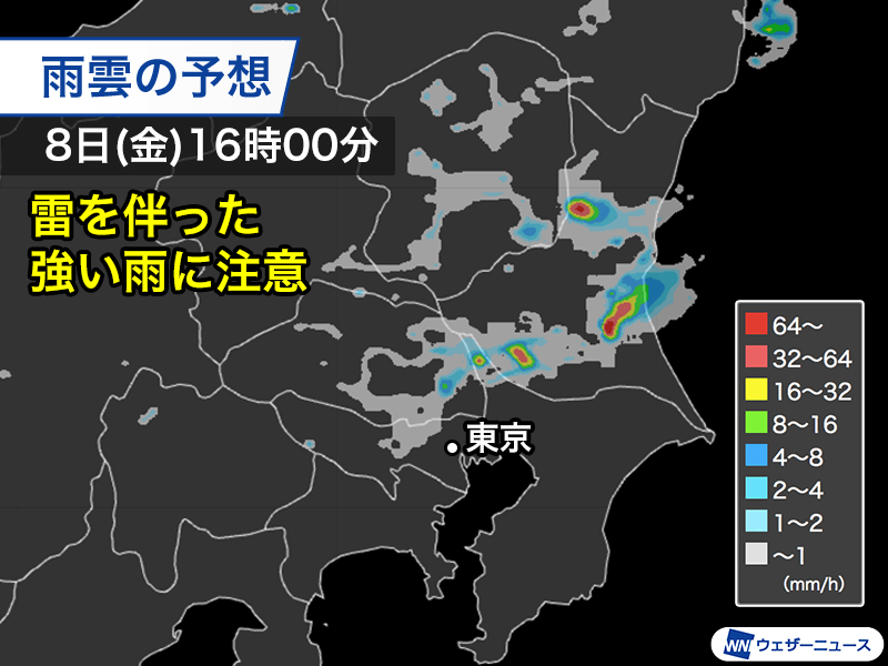 早い所では昼頃から雨雲が発生し、午後は平野部を含む広い範囲で雨雲が発達する見込みです。内陸部を中心に雷を伴った強い雨の降る所があり、東京都内まで雨の範囲が広がる可能性があります。