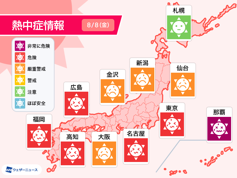 前線の北側に入ったエリアは湿度が低く、関東や東海では40%前後まで下がってきました。その分だけ熱中症のリスクはやや低下し、東京、名古屋はともに「危険」レベルです。