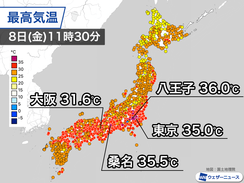 11時30分までの最高気温が最も高いのは東京都八王子市で36.0℃まで上昇。昨日は雨で気温が上がらなかった関東北部も暑さが戻り、群馬県桐生市は35.7℃を観測し、東京都心も35.0℃と猛暑日です。