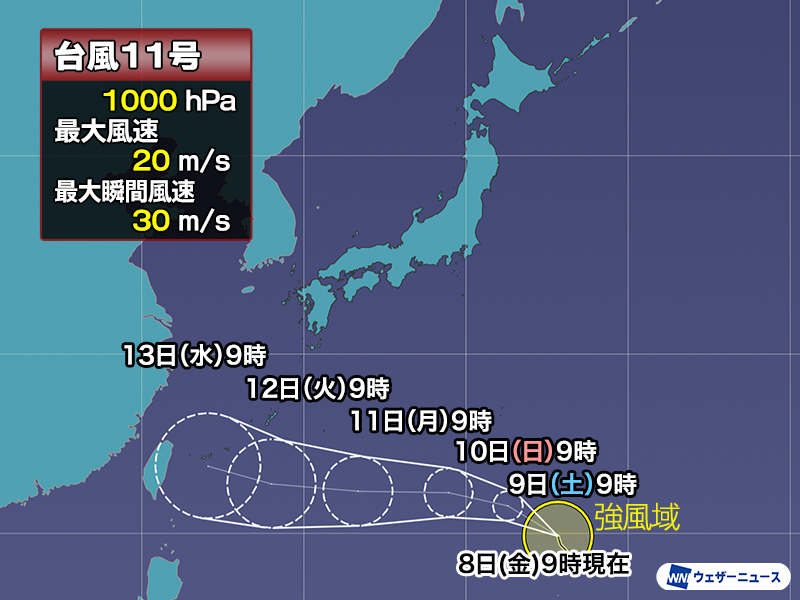 台風11号はこの先の進路予想を見ると、このまま西寄りに進んで、10日(日)には沖ノ鳥島の北を通過し、12日(火)頃からは沖縄の南を西進する予想です。それほど発達せず、暴風域は伴わない見通しです。